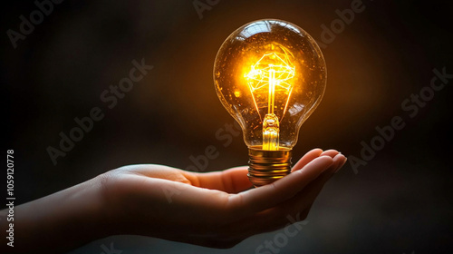 businessman holds a glowing light bulb, symbolizing innovation and bright ideas. The warm light contrasts with a professional setting, representing creativity and the spark of new possibilities in bus