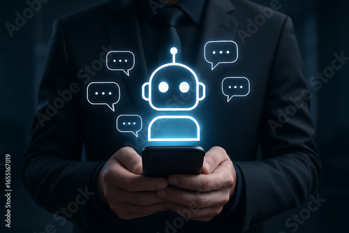 Businessman holds a smartphone with a glowing robotic head and speech bubbles, representing artificial intelligence in communication, customer support, and technology