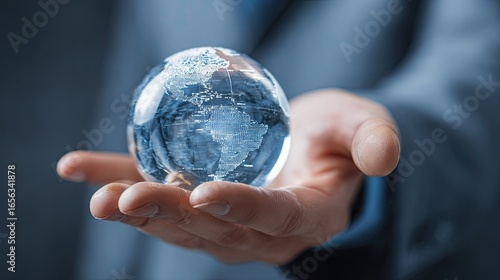 Businessman holds crystal globe of Earth