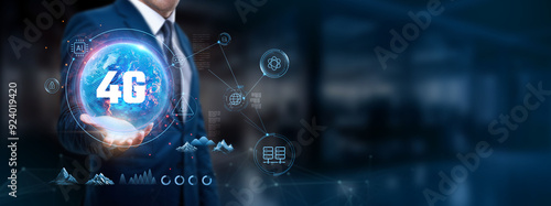 Businessman holds global network structure enabled by 4G technology, high-speed connectivity, seamless communication, and enhanced mobile services.