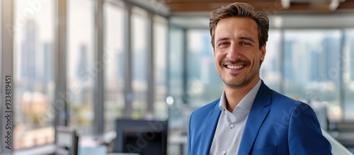 Businessman in a blue suit, smiling, against a blurred modern office interior and cityscape view, close-up with copy space on the right.