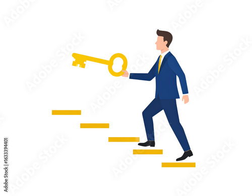Businessman in a blue suit with a yellow tie climbing stairs and holding a large golden key.