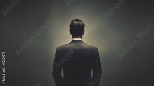 Businessman in a suit captured from behind. The executive's solitary stance, symbolizing the unique challenges, decisions, and responsibilities inherent in corporate leadership. Generative AI