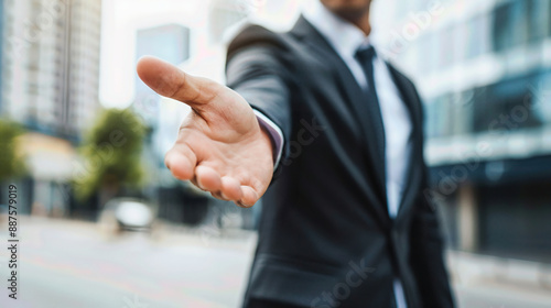Businessman in a suit reaching out for a handshake on a city street, symbolizing partnership, collaboration, and professional connection.