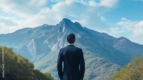 businessman in a suit stands at the base of a towering mountain, symbolizing the significant challenges and obstacles he faces in his career.