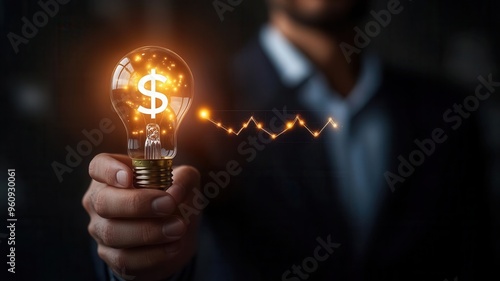 Businessman in background touches glowing light bulb with dollar sign, rising graph ahead, symbolizing investment growth, photo-realistic rendering