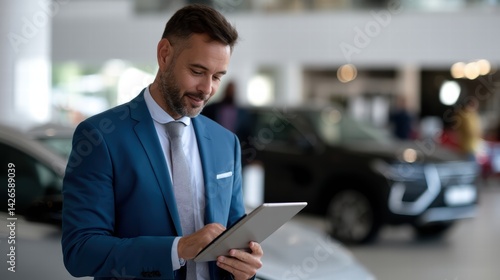 businessman in blue suit is using tablet in modern car showroom, showcasing professional and confident demeanor. atmosphere is bright and inviting, highlighting luxury vehicles