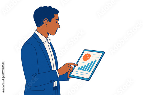 Businessman in blue suit using tablet with bar and pie charts, flat illustration style, isolated on white background, concept of data analysis, Ai generative