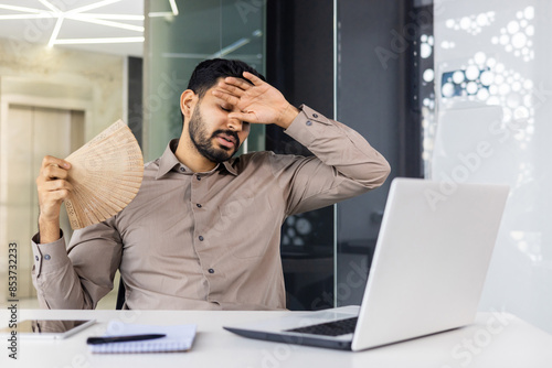 Businessman in brown shirt fanning himself, feeling stressed due to heat in a modern office setting while working on a laptop.