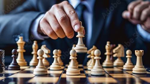 Businessman in Formal Suit Carefully Crafting Decisive Moves on Chess Board Representing the Strategic Thinking and Intelligence Required for Navigating Business Challenges and Opportunities