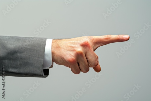 Businessman in gray suit pointing forward with hand and forearm isolated on gray Clipping path included
