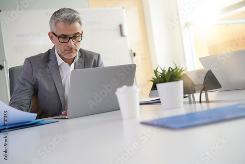 Businessman in office working on laptop