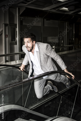 Businessman in Panic. Strong Young Man on Escalator. Stress Concept.