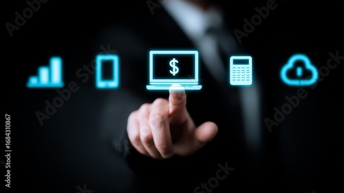 Businessman in suit activates digital interface, touching the future of technology