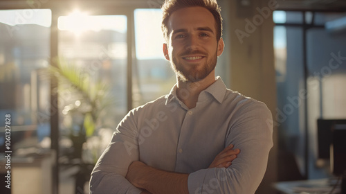 Businessman in suit crossed arms in office confident smile professional finance investment insurance work background with copy space