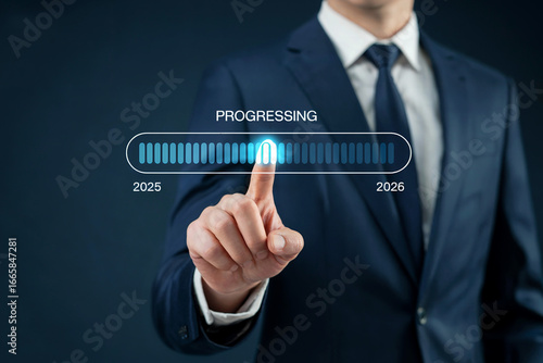 Businessman in suit interacting with futuristic digital progress bar interface technology
