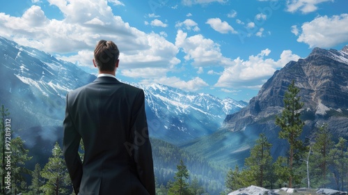 Businessman in suit looking at mountain landscape, blue sky with clouds and trees. Business success concept, ultra realistic photo