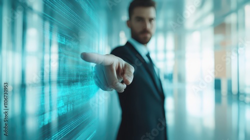 Businessman in suit pointing at blank wall perfect for presentations, marketing visuals and displaying information