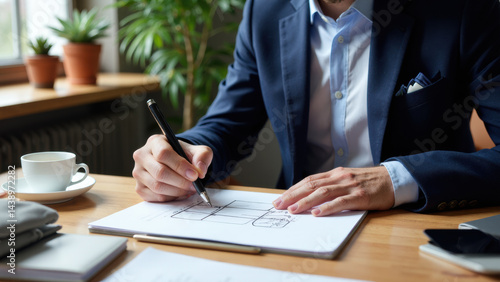 Businessman in suit sketches designs on paper while seated at wooden desk, surrounded by plants and coffee cup