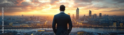 Businessman in Tailored Suit, Overlooking Bustling Cityscape at Sunset Visionary Leadership, Strategic Management, and Business Success A Powerful Image Representing Ambition, Progress, and the