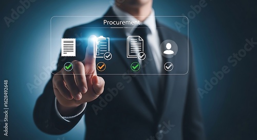 Businessman interacting with a futuristic digital interface displaying data and workflow management elements