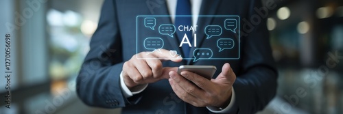 Businessman interacting with chat ai interface on smartphone screen