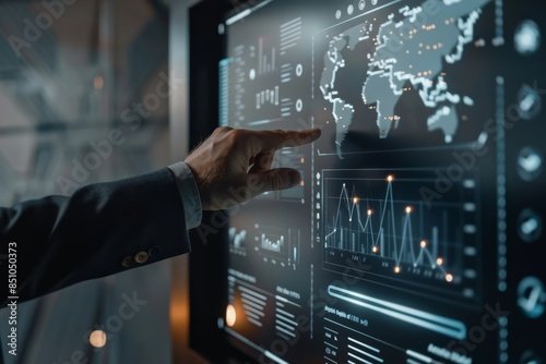 Businessman interacting with virtual data: Futuristic business technology on a blurry dark background