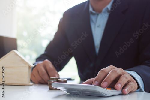 Businessman investing in real estate calculating income and analysing mortgage asset.