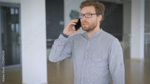 Businessman is moving. Phone conversation in office.