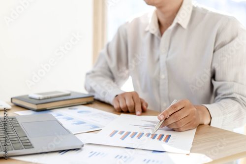 Businessman is reading monthly sales summary of each salesperson. He sits and works in his private office. Sales management concept.