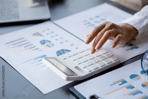Businessman is using a calculator to calculate company financial figures from earnings papers, a businessman sitting in his office where the company financial chart is placed.