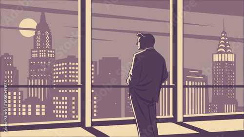 Businessman looking at cityscape at night urban view from skyscraper window modern illustration.