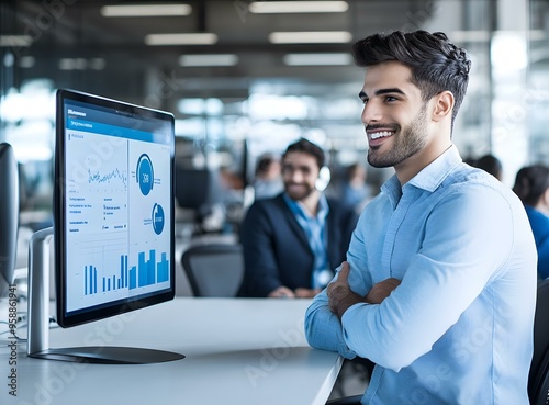 Businessman Looking at Computer Screen with Charts and Graphs in Office