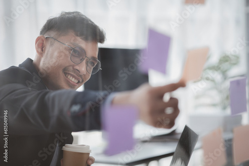 Businessman looking at post-it notes on mirror, he looks at data after a meeting between executives and department employees to discuss and grow the company. Management concept of a startup company.