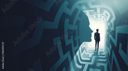 Businessman looking at the exit of a dark corridor with glowing light