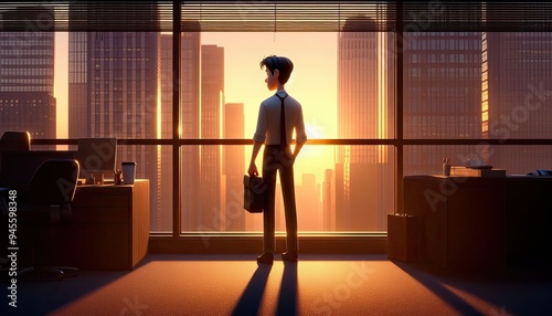 Businessman Looking Out Window at City Skyline