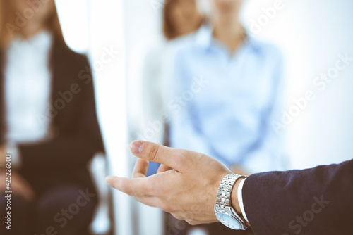 Businessman making presentation to group of people in office. Speaker delivering a seminar to his colleagues or business training. Teamwork and coaching concepts in business