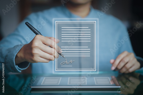 Businessman, man using pen, electronic signing, paperless, on screen, virtual image, online, close-up.