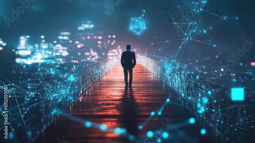 Businessman Navigating an Arrow Bridge Towards Blockchain Technology. AI generated illustration