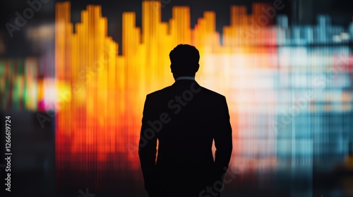 Businessman observing data analytics display in a modern office setting with vibrant visuals