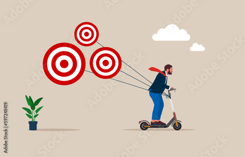 Businessman on a electric scooter traveling Tries to pull many target. Planning and successful. Flat vector illustration