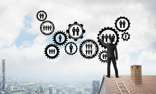 Businessman on house roof presenting teamwork and connection concept. Mixed media