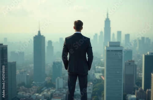 businessman on the roof of a skyscraper looks at the city. business and leadership concept