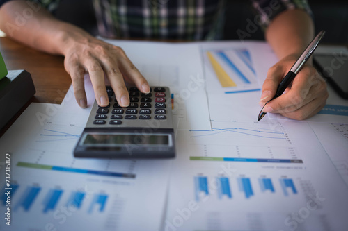 Businessman or accountant hand holding pen working with calculator and laptop computer for business financial document report, Business financial and accounting concept