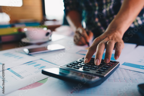 Businessman or accountant using pen and calculator for audit budget and finance of company on wooden desk in office.Auditor financial or bookkeeper concept.