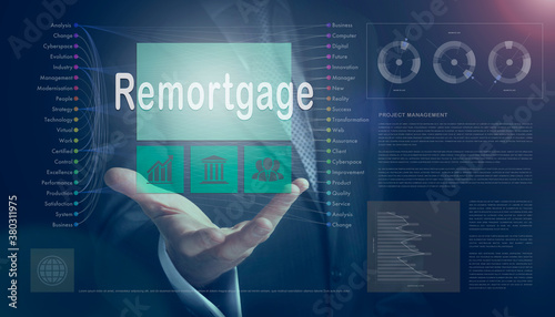 Businessman outreached hand holding a Remortgage business concept on a computerised screen display.