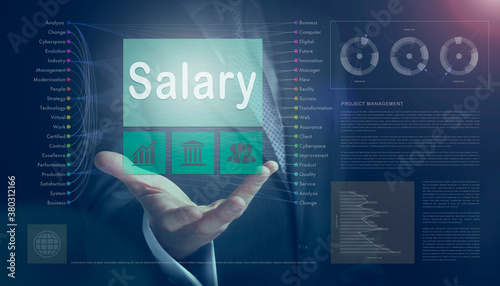 Businessman outreached hand holding a Salary business concept on a computerised screen display.