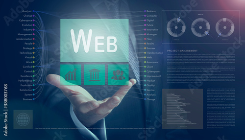 Businessman outreached hand holding a Web business concept on a computerised screen display.