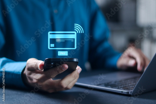 Businessman Pay by credit card via electronic wallet. Banking app and e-payment. online banking. Shopping by mobile and connected card.