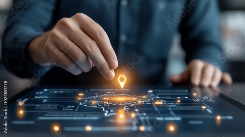 Businessman placing a glowing pin into a map on a large interactive screen, representing a strategic goal, 3D illustration